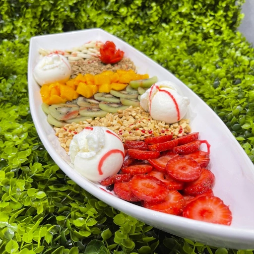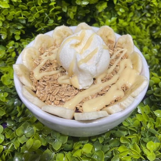 1l de açaí, morango, banana, leite em pó, granola, chocoball, sorvete e leite condensado