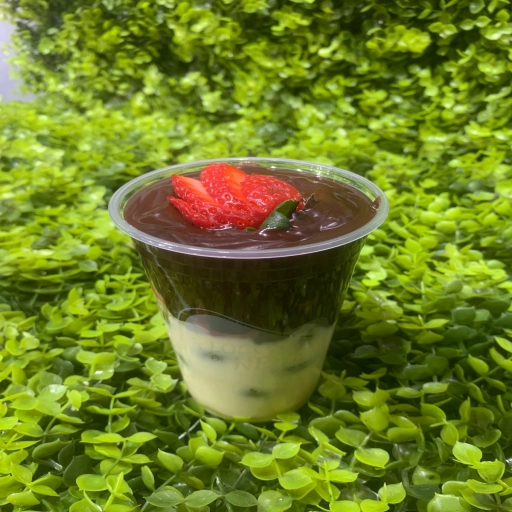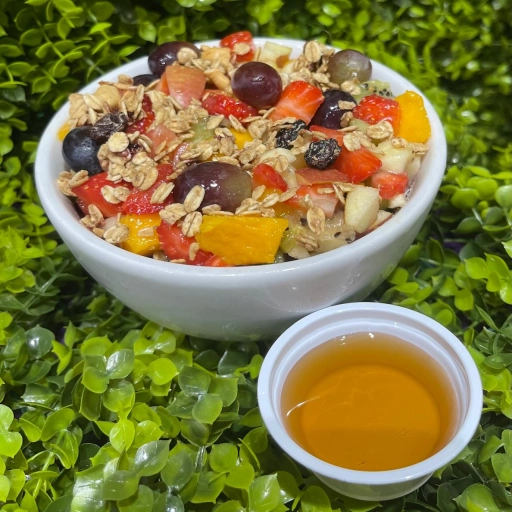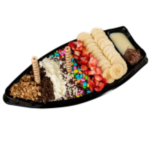 1l de açaí, banana, morango, ovomaltine, leite em pó, granola e calda de morango